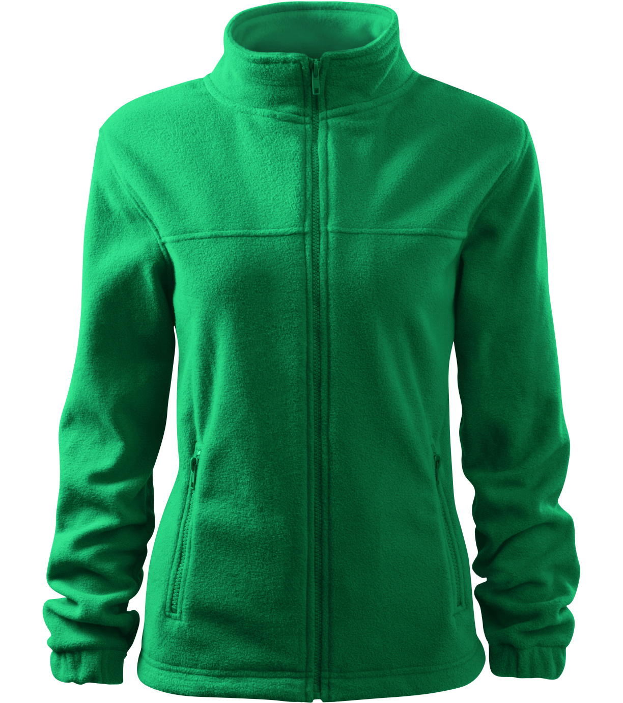 Dámska fleecová bunda v mierne zateplenom strihu z hrejivého materiálu vhodného na vyšívanie a gravírovanie, má vnútorný výstrih zatavený páskou vo farbe vrchného materiálu, kostený zips po celej dĺžke, vrecká s kosteným zipsom, spodný lem s elastickou šnúrkou, lemy rukávov stiahnuté gumou a úpravu proti žmolkovaniu na vonkajšej strane.