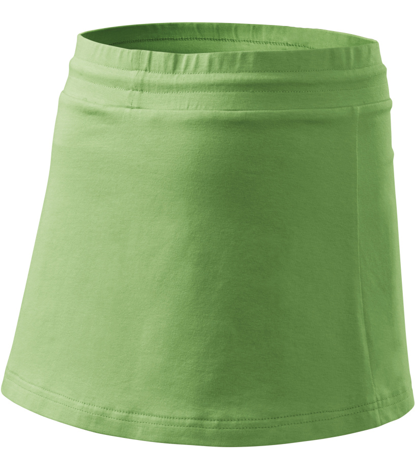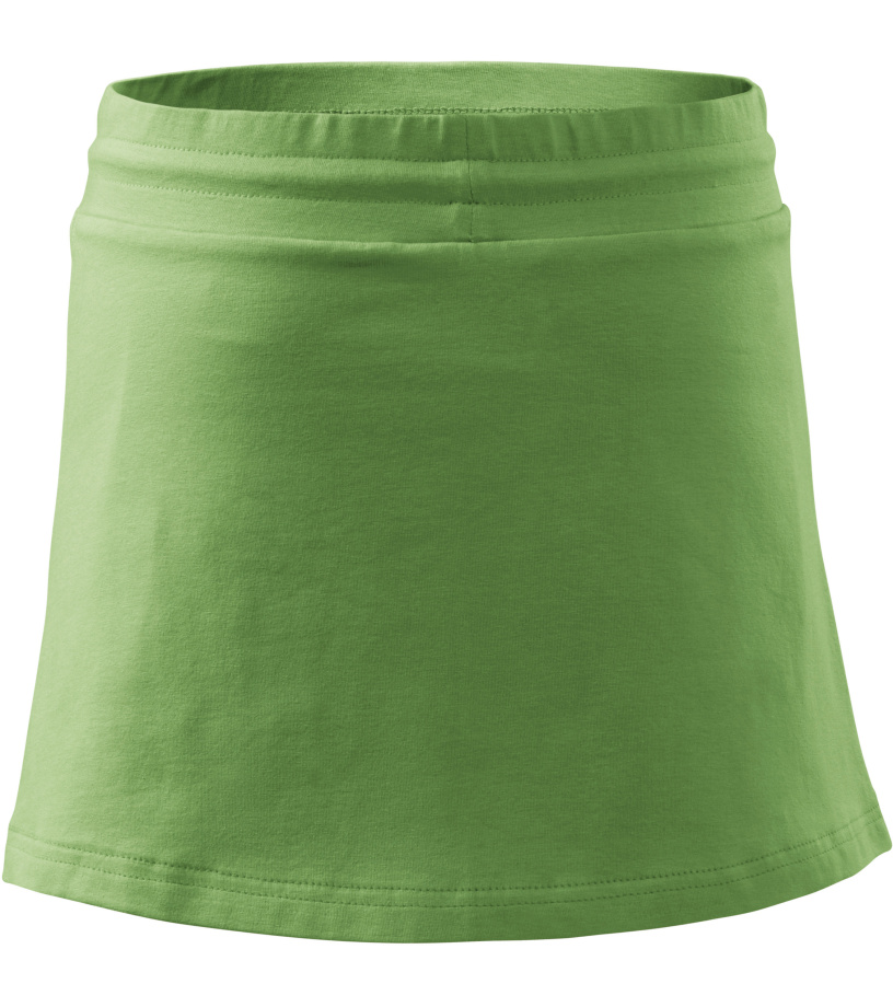 Dámska sukňa 2v1 so všitými šortkami v krátkom strihu do A zo strečového materiálu, ktorý udržiava tvarovú stálosť, ideálna na šport a pohybové aktivity, má široký golier v páse s elastickou šnúrkou.