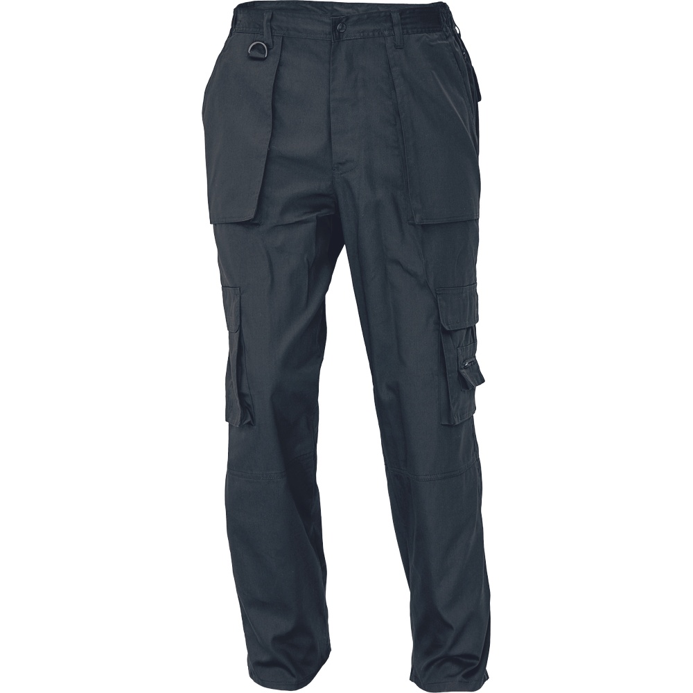Pánské pevné praktické kalhoty s mnoha funkčními kapsami. V pase na gumu a s poutky na pásek.