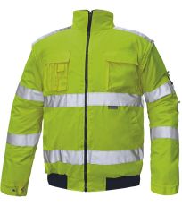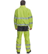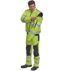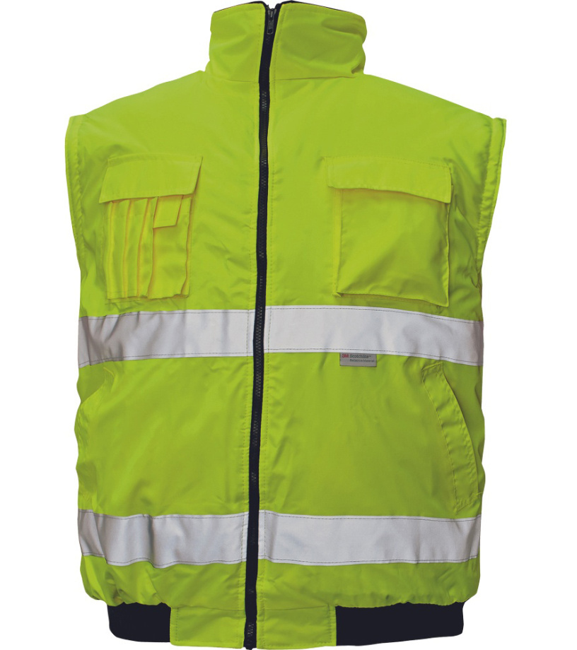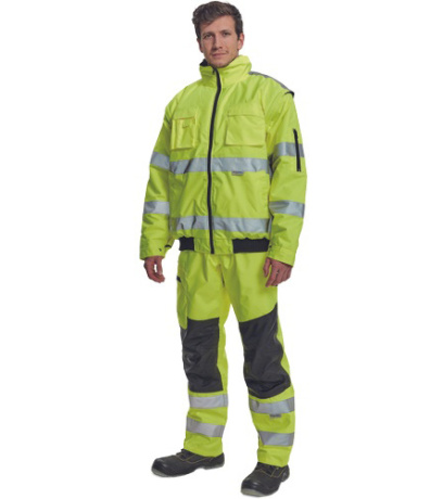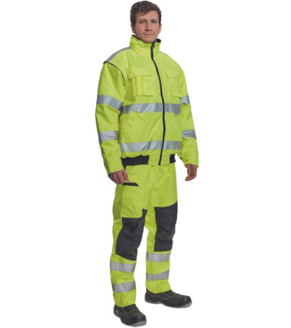 Výstražná a nepremokavá bunda s vysokou viditeľnosťou podľa normy EN 471, 3M reflexnými pásikmi, odopínateľnými rukávmi, pružným pásom, prelepenými švami, s vodeodolnosťou tr. 3 podľa normy EN 343 a paropriepustnosťou triedy 1 podľa normy EN 343.