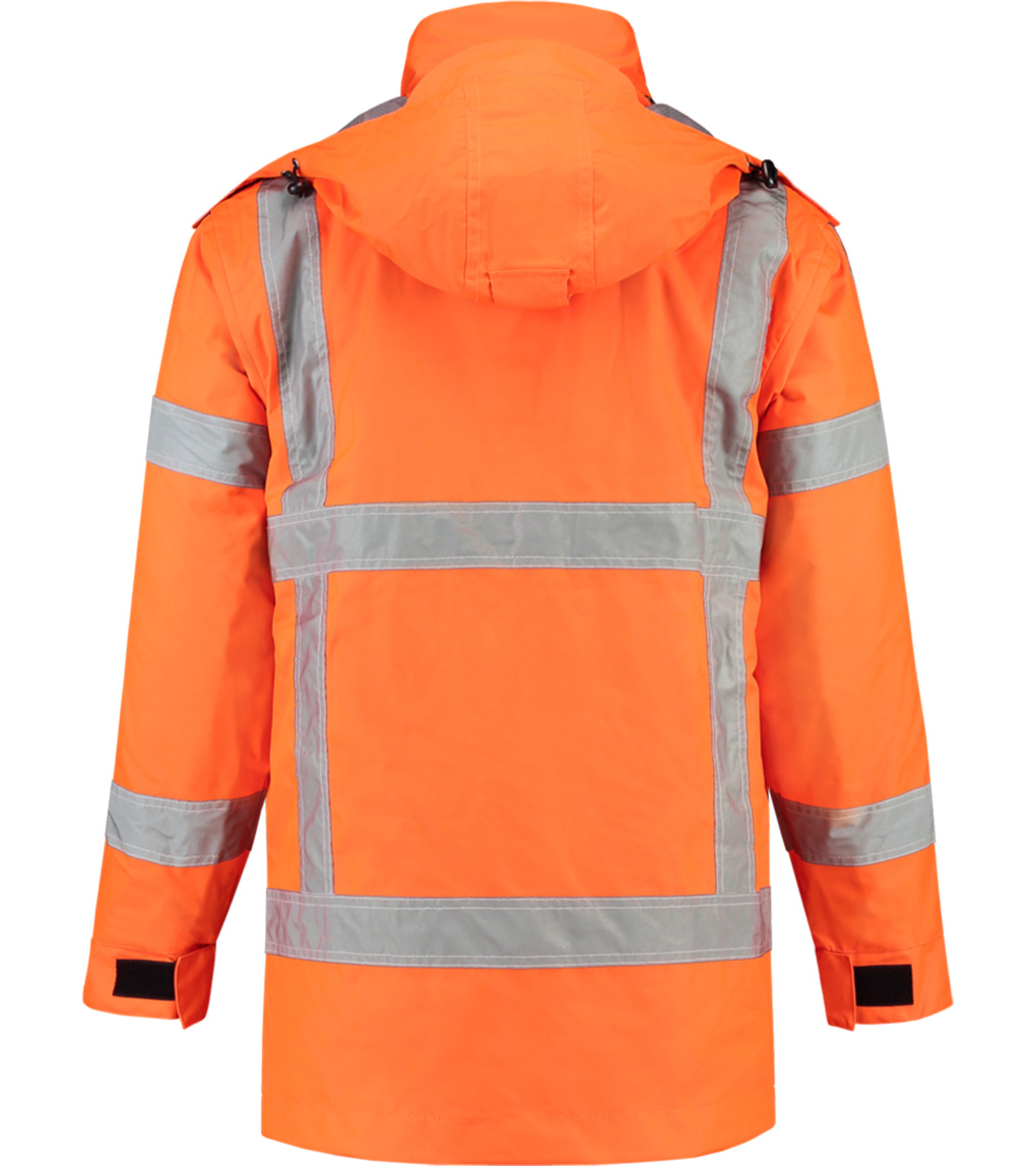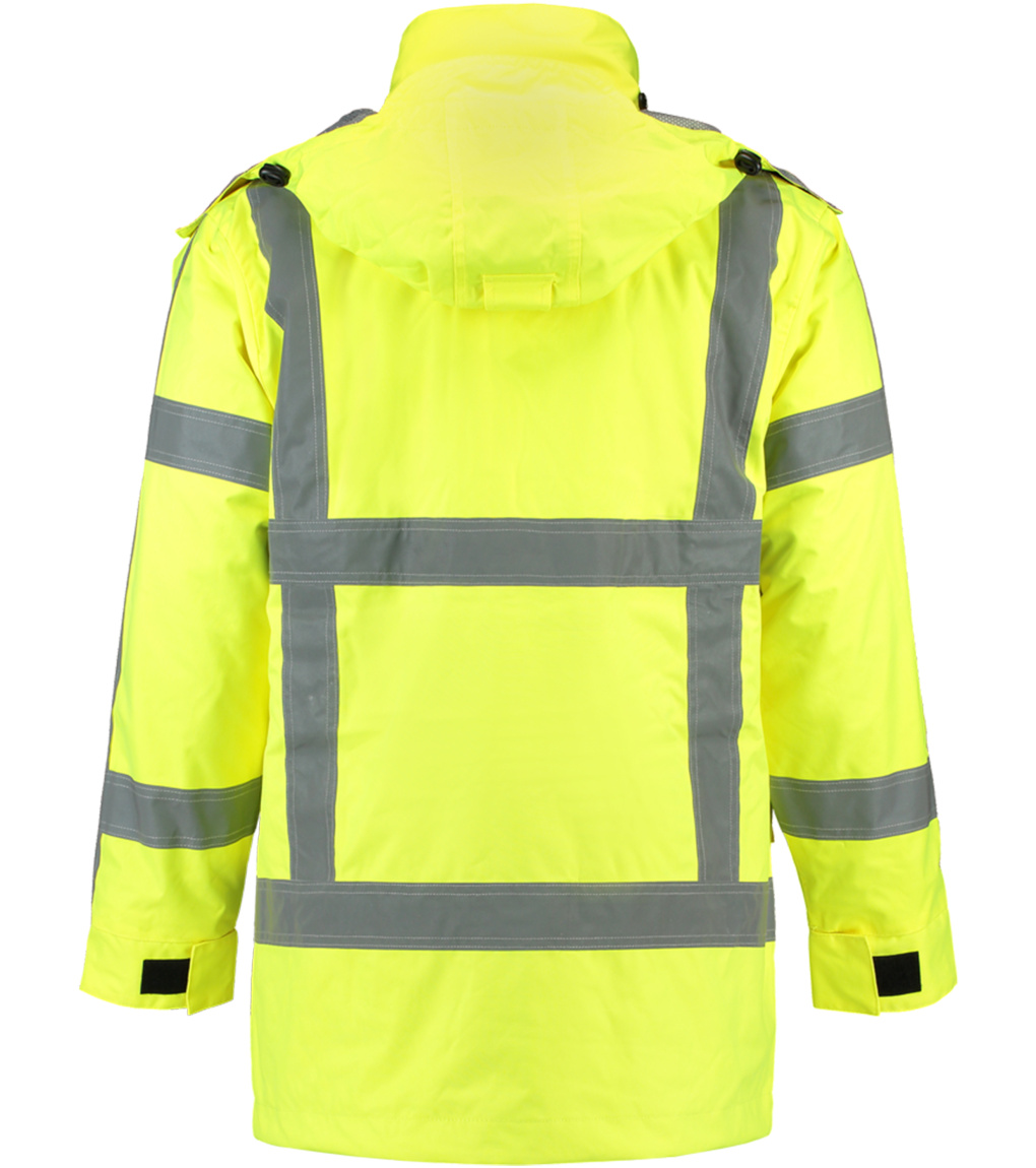 Uni pracovná bunda s vysokou viditeľnosťou a retroreflexnými pruhmi. Nepremokavý, vetruodolný a priedušný materiál na pohodlné nosenie. Odnímateľná kapucňa, vetracie otvory v podpazuší, vnútorné náprsné vrecká, dvojcestný otvorený zips, vodotesné zipsy, podlepené švy, odnímateľná teplá podšívka. Certifikované podľa noriem EN ISO 20 471:2013 (trieda 3), EN 343:2003 (trieda 3:1).