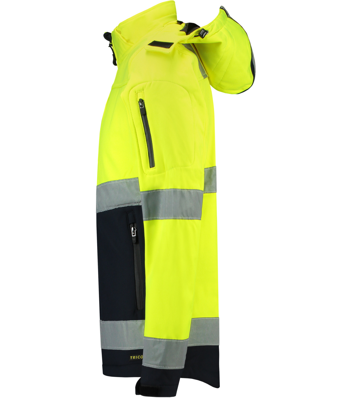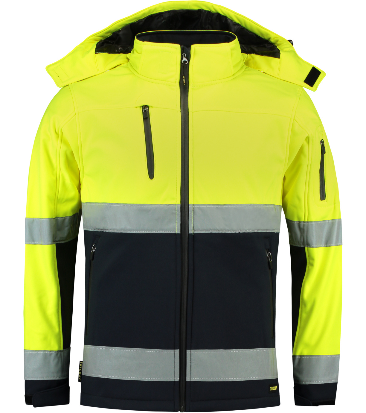 Softshellová bunda je odev s vysokou viditeľnosťou vyrobený z nepremokavého, vetruodolného a priedušného materiálu. Má retroreflexné pruhy, odnímateľnú kapucňu, kostený zips po celej dĺžke s ochranou brady, vrecká na reverzný špirálový zips, náprsné vrecko so vstupom na slúchadlá, nastaviteľné lemy rukávov na suchý zips, tvarovaný a mierne predĺžený chrbát a sťahovací spodný lem.