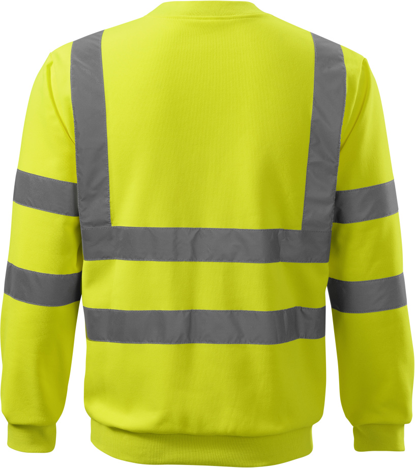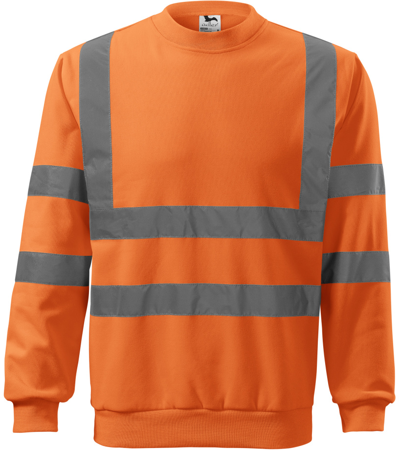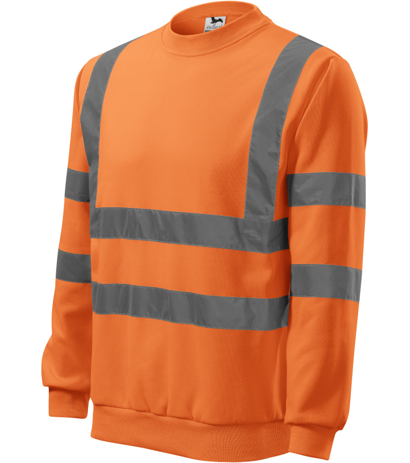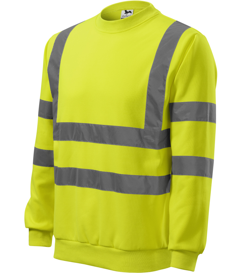 Unisex mikina rovného strihu s vysoko viditeľnými bočnými švami z hladkého fluorescenčného materiálu vhodného na vyšívanie a potlač má česanú vnútornú stranu, certifikované reflexné pruhy 3M, certifikáciu podľa noriem EN ISO 20 471 (trieda 3) a EN ISO 13 688 a rebrovaný úplet 1:1 na leme, manžetách a výstrihu.