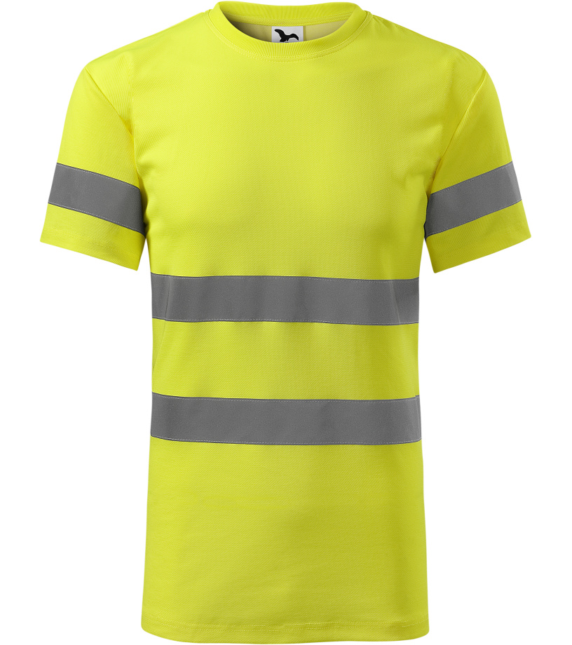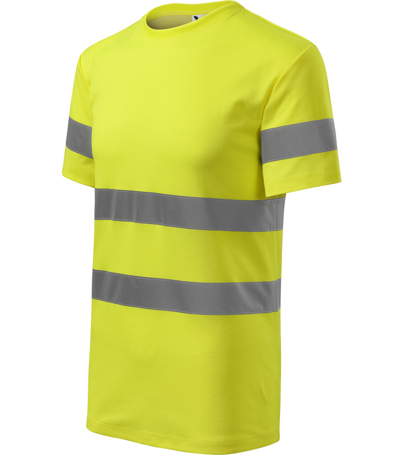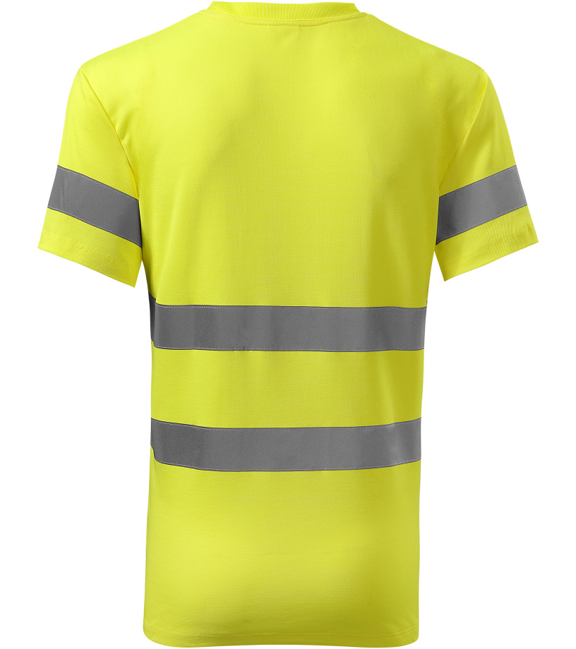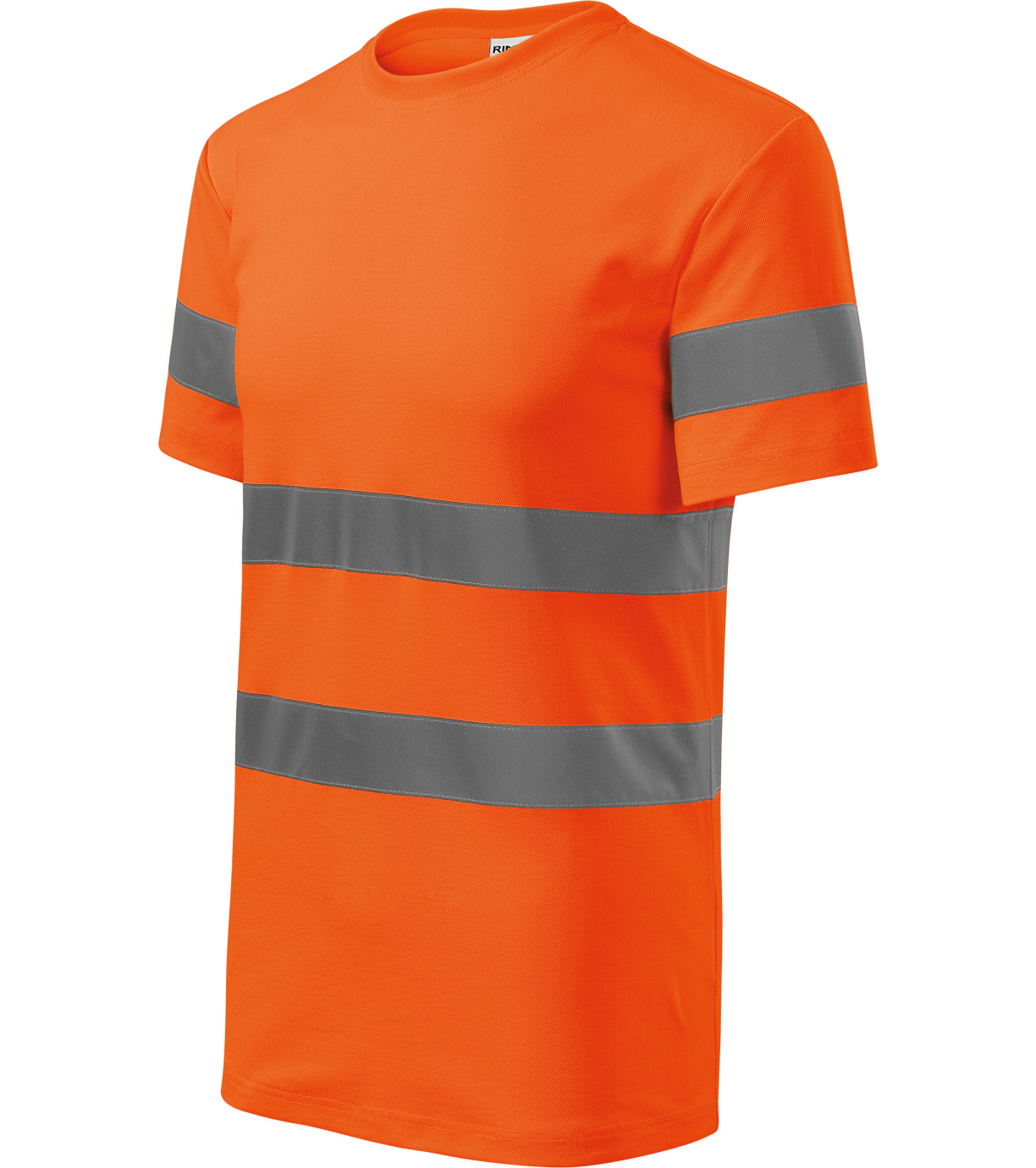 Unisex tričko rovného strihu s vysoko viditeľnými bočnými švami vhodnými na vyšívanie a potlač má fluorescenčnú polyesterovú vonkajšiu stranu, bavlnenú vnútornú stranu, certifikované reflexné pruhy 3M, rebrovaný úplet okolo krku 1:1, zosilnenie ramenného švu a certifikáciu podľa noriem EN ISO 20 471 (trieda 2) a EN ISO 13 688.