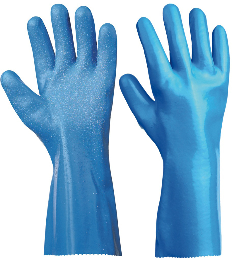 Rukavice se šitým bavlněným úpletem máčeným v PVC s nitrilem. Ochrana proti mechanickému a chemickému riziku, s posypem v dlani.