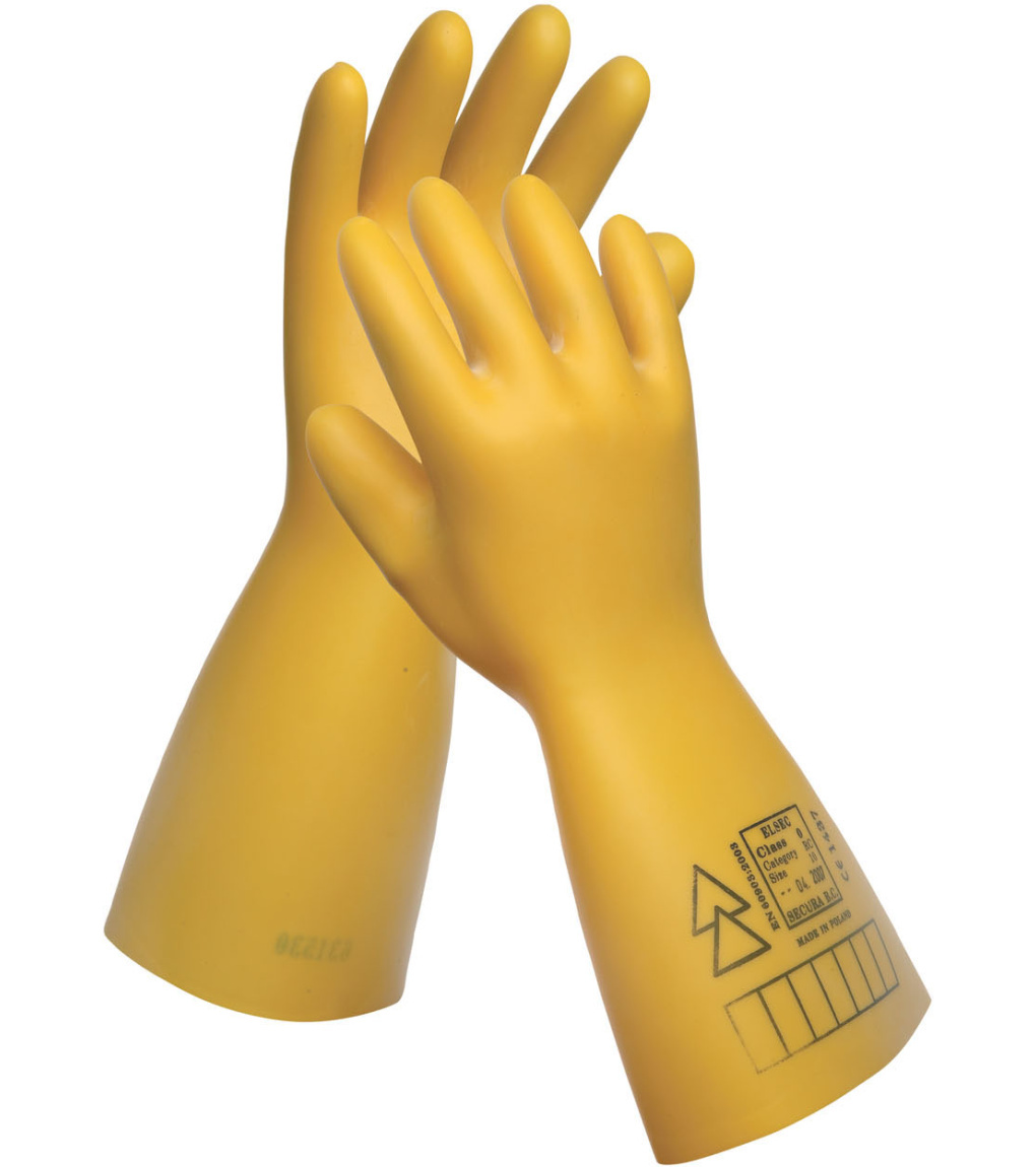 Dielektrické izolační rukavice z kvalitního přírodního latexu pro ochranu před nebezpečným napětím.